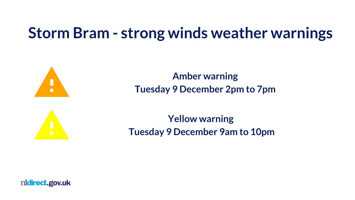 Following Met Office advice ahead of Storm Bram of a yellow weather warning from 9.00 and 22.00 and an Amber warning from 14.00 and 19.00 on Tuesday, 09 December 2025, Derry City and Strabane District Council, is advising the public that the weather conditions could have an impact on some of its services.