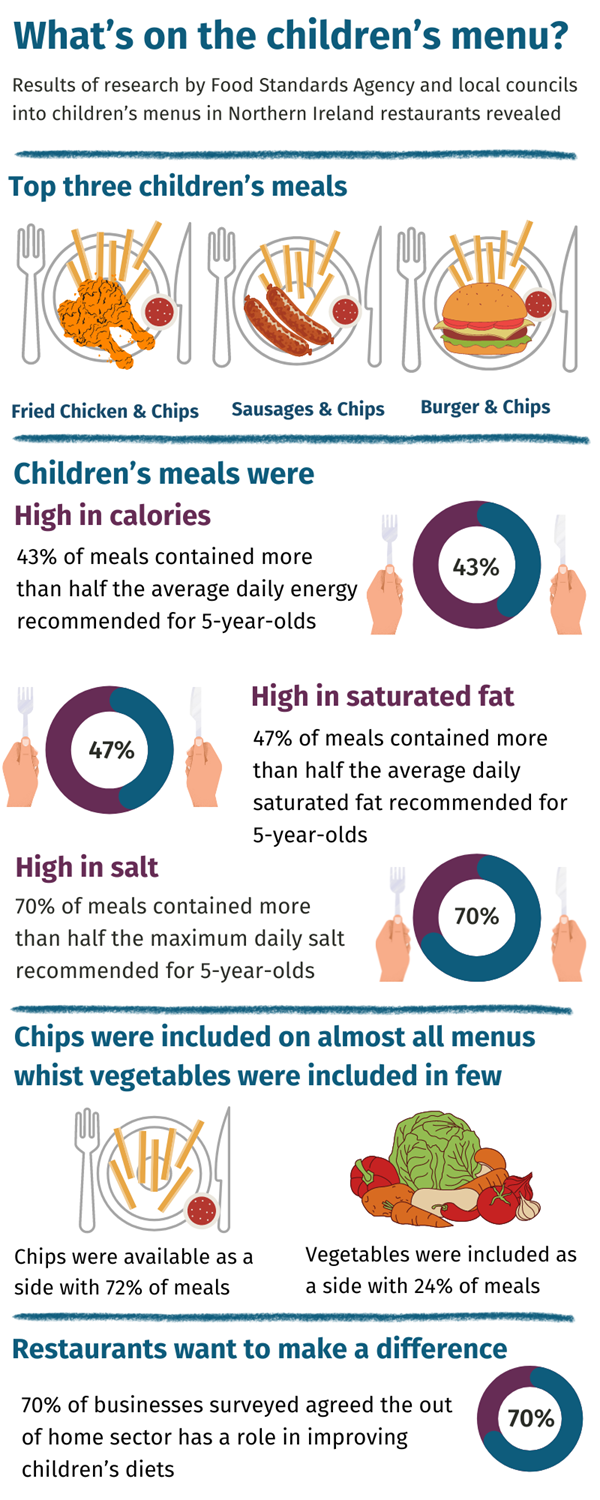 “Families in Northern Ireland eat out regularly and so food businesses such as restaurants, fast food outlets and cafés have significant influence over consumer diets.  As evidence suggests food prepared out of the home tends to be higher in energy, saturated fat, sugar and salt and lower in fruit and vegetables than meals prepared at home, the Food Standards Agency (FSA), Derry City and Strabane District Council and other councils across Northern Ireland conducted research into the foods available to children when eating out and the nutritional content of this food.