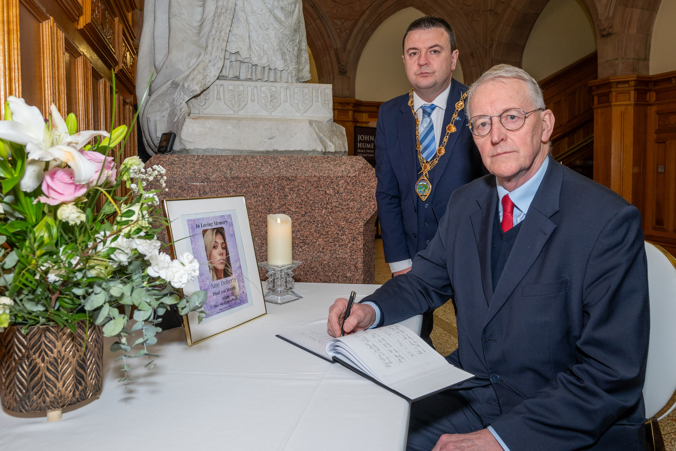 Mayor of Derry City and Strabane District Council, Cllr Ruairí McHugh hosted the Secretary of State for Northern Ireland, the Rt Hon Hilary Benn, when he visited the Guildhall this week to sign the Book of Condolence for Amy Doherty.