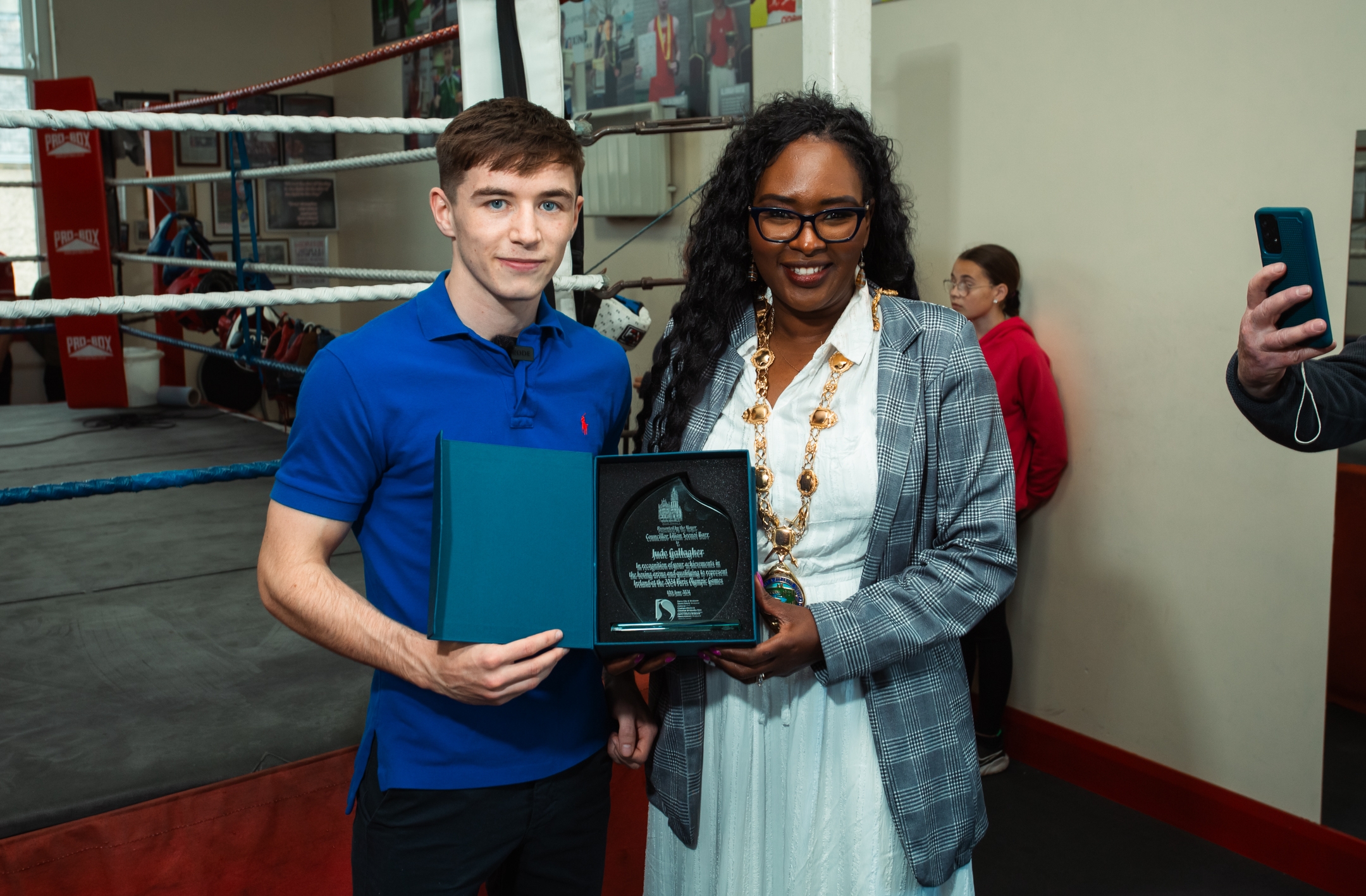 Jude took some time off from his busy training schedule to meet with Mayor Barr and to discuss his hopes as he gets ready for the Olympics in Paris in July and August. Jude also took the opportunity to show the Mayor around the Two Castles Athletic Boxing Club where she met with other club members. The Mayor presented the local Olympian with a plaque marking his achievements and qualification in this prestigious sporting event.