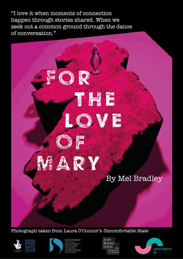 The play is a bilingual autobiographic mapping of her journey to find the Virgin Mary, a figure glorified as the epitome of female identity. For the Love of Mary examines her lost humanity, rediscovered through stories shared by women living in Ireland, gathered around the kitchen table, often over a pot of tea. It has been produced with assistance from Derry City and Strabane District Council’s Individual Artist Fund and the University of Atypical and will be premiered at the Strabane venue on Friday October 6th at 7.30pm as part of a wider tour. The performance explores the atrocities committed against women, the institutionalisation of women, the Repeal and Decriminalise movements alongside acts of devotional faith and love. All layered against a backdrop of religious ideology and national identity. Viewed through the lens of a woman from a Protestant/Unionist background, displaced by the troubles into a Nationalist area two years before the Good Friday Agreement was signed it questions the cultural influence of her prescribed ideals of courage, endurance, hope, faith and confidante in parallel to the experiences of pregnancy, consent, agency, crisis and sexuality by Irish women. The event is part of Bounce Festival 2023 organised by University of Atypical for Arts and Disability. University of Atypical's main funder is The National Lottery through the Arts Council of Northern Ireland made possible by Lottery Players.Tickets The Love of Mary at Alley Theatre are priced at £10 / £8 (concession) available from the Alley Theatre website www.alley-theatre.com or via the box office 028 71 384444.