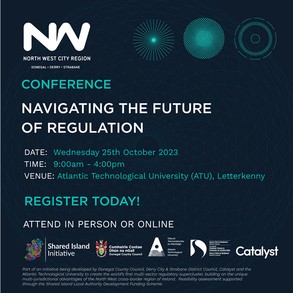 This conference is part of initiative being developed by Donegal County Council, Derry City & Strabane District Council, ATU, Catalyst and ALPHA Innovation, to establish the world’s first multi-sector Regulatory Supercluster in the North West City Region - working across sectors and borders to become a recognised world leader in regulatory technology.