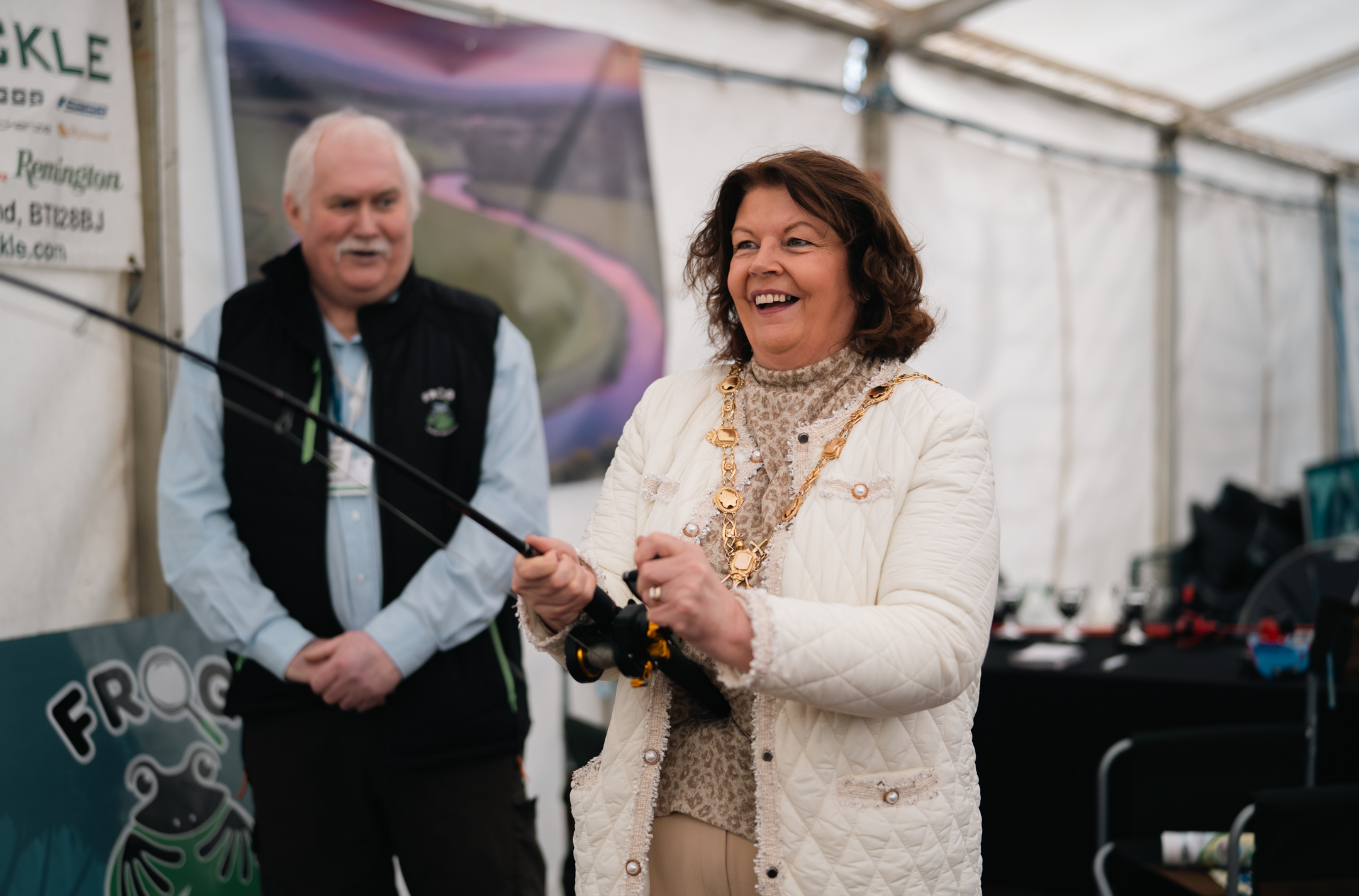 Mayor of Derry City and Strabane District Council, Councillor Patricia Logue, visited the Melvin on Saturday where she spoke with traders and demonstrators and had a go at casting for herself.