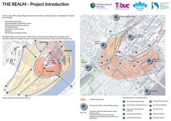 The Realm Project is one of four key capital projects being taking forward with funding from The Executive Office Urban Villages Initiative in the Bogside and Fountain area. The overall aim of the Realm Project is to provide a high-quality environment connecting the four sites - New Gate Cultural Hub, Gasyard Heritage & Exhibition Centre, Redevelopment of Meenan Square and the Realm Project - and other visitor attractions. It will create in an attractive and accessible shared space within the Bogside, Fountain and Bishop Street Urban Village Area.