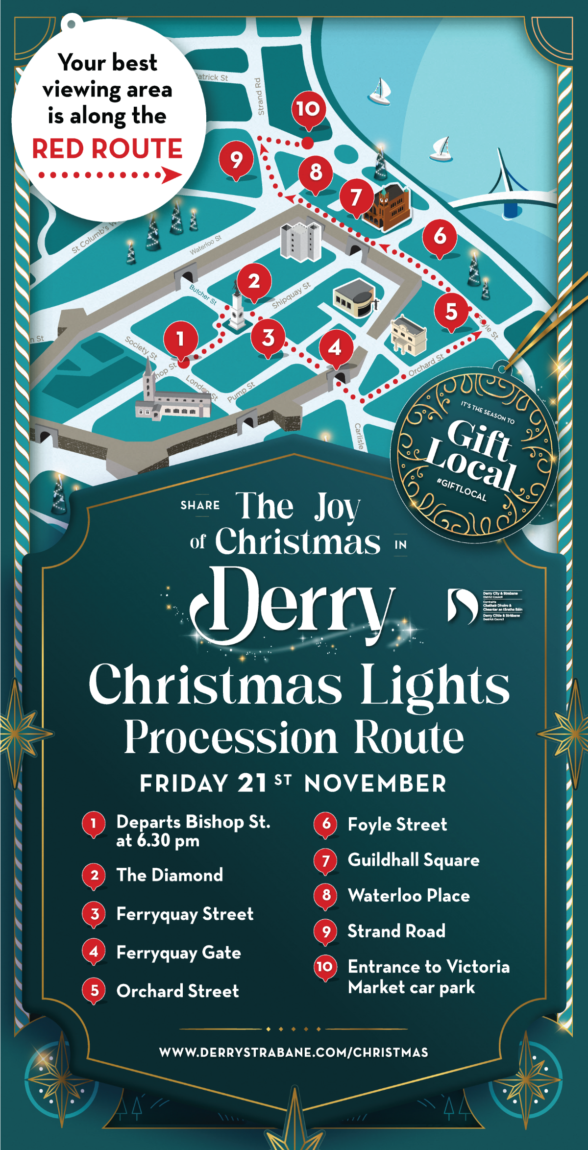 ⭐️ Parade Route: Bishop Street, The Diamond, Ferryquay Street, Ferryquay Gate, Orchard Street, Foyle Street, Guildhall Square, Waterloo Place, Strand Road, finishing at Victoria Market.